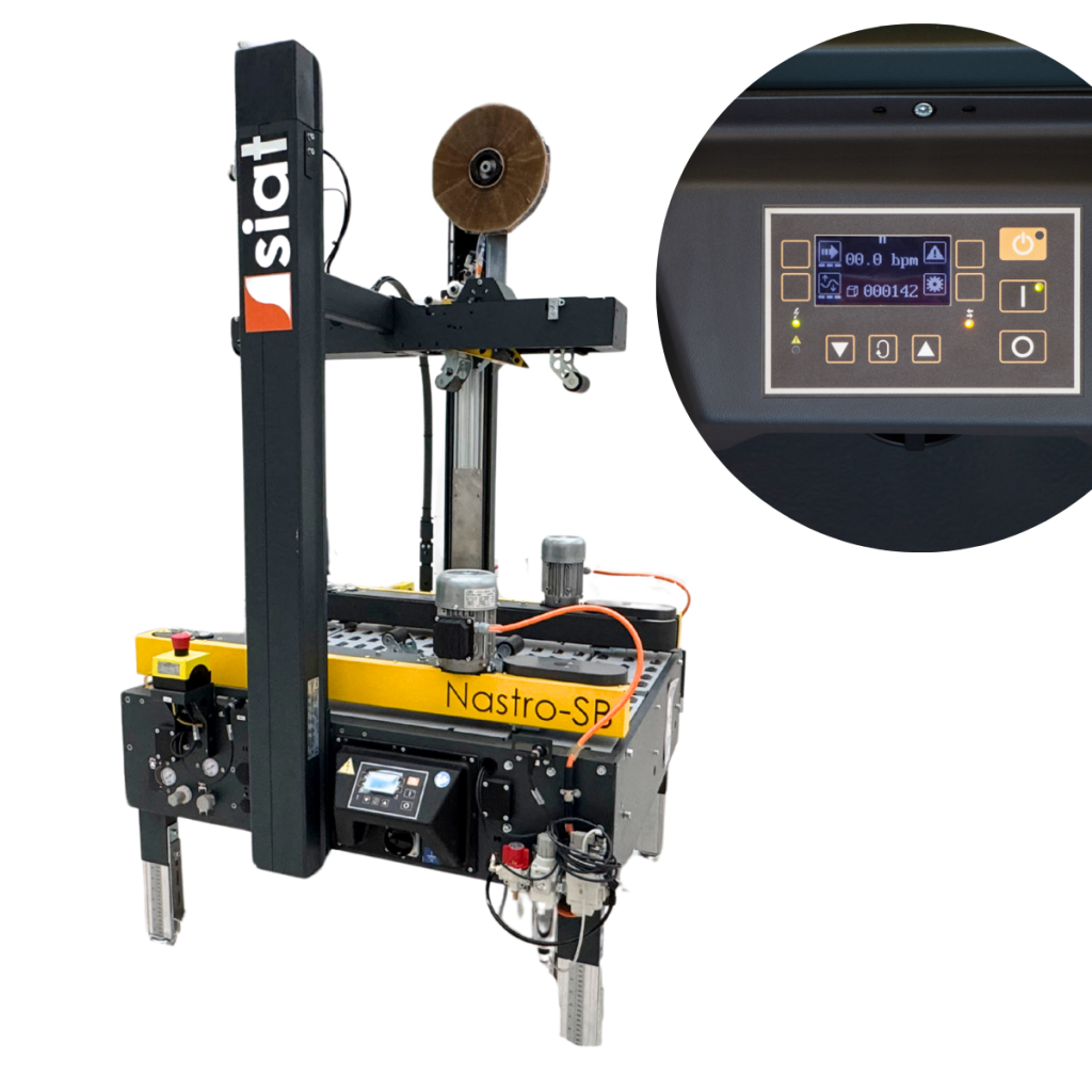 Nastro-SB™ AQUA je poluautomatska mašina za lepljenje kutija koju je SIAT dizajnirao i konstruisao za jednostavno, brzo i ergonomski efikasno nanošenje ojačane i neojačane vodom aktivirane trake. Namenjena je kutijama fiksnih dimenzija — od malih, preko srednjih, pa sve do velikih i „king size“ formata — i opremljena naprednom logikom rada radi optimalnih performansi.